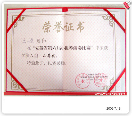此图片仅显示局部,请点击查看完整图片  妈妈我特意把照片放的很大,可以看清楚吧?18号,小丫参加了“安徽省第六届小提琴比赛”的学前A组比赛,演奏的曲目一:《b小调协奏曲第三乐章》(规定曲目),曲目二:《卖汤圆》(自选曲目),A组参赛选手45名,小丫的成绩排在第四,可惜一等奖只取三名,5~。 田老师本来如小丫所愿担任的学前组评委,比赛前一天接通知改担任20号五六年级的评委,为了看小丫的表现特地跑来和我们“泡”了一上午,小丫抽签号为24号,不前不后,妈妈暗自庆幸,“不是前几号就好。”。虽然比赛的现场家长禁入,不过有田老师开道,妈妈还是比较顺利的进去了,呵呵。小丫的临场表现尚可,虽然没有平时回琴拉的好,但用田老师的话说就是,“第一次参加比赛可以发挥到这样水平应该算很不错的,没有紧张(表情还是严肃了点)。难度高的几个地方都拉得很好很清楚,不过平时从来没有错过的地方却错了。"师生俩还争论,老师说小丫把《b小调协奏曲第三乐章》里最后的先升1后还原1拉成先还原后升,而小丫说自己全部拉成了还原1,CC,妈妈听出那段小丫拉错了,不过错在哪里却是说不出来 。