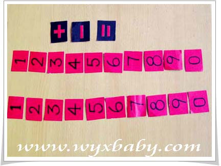 小丫幼儿园不用学珠心算,所以老师如何教孩子加减法就是我一直特别好奇关心的事情。小丫之前回来说新学了“银行游戏”,每次游戏要三个小朋友一起玩,在听了她大致的描述后我就用家里的彩色卡纸做了一套和“银行游戏”相类似的卡片,这应该就是蒙式教育中最基础的加减法了吧。 周末和小丫一起在家玩,第一步先把从0~9的数字卡片按顺序摆放好,我和小丫一人管一排: