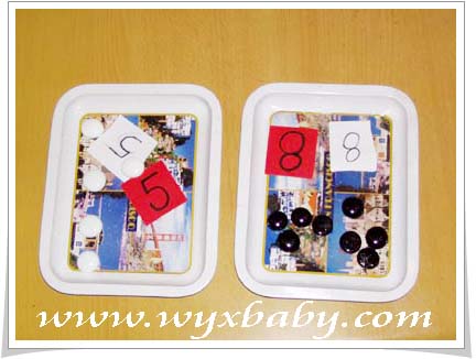 此图片仅显示局部,请点击查看完整图片  之后每人从LG那里领取一张写了数字的纸条,按纸条选出正确的卡片放在各自的盘中,家里现成的围棋子正好代替幼儿园教具中的小方块积木,每人取得和卡片上数字相符的棋子: