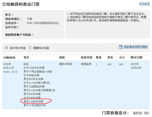 此图片仅显示局部,请点击查看完整图片  明天要出去旅游,今天说啥也得把门票款付清,因为已经过了9月30日的最后付款期限,不能直接从信用卡上划钱而必须从银行柜台交钱,手续那个繁复啊,即使很顺利也花了半个多小时,银行的几个工作人员倒是不住恭维:“不错诶,你还抽中了,好运气!有110米栏诶,可以看到刘翔了!”妈妈有点漂漂了,呵呵,不过这2张票一家三口谁去?看来还得想法再买一张才是。