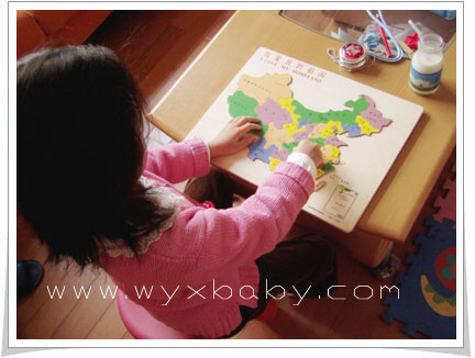 孩子的记忆力真的令人惊讶,之前给萱萱买了中国地图的拼图,开始她一直还学不会,到2日还只能拼其中几个大块,而到3日突然一下就什么都会了,让爸爸妈妈大吃一惊,真不知道她那小脑袋瓜是怎么记住的。她的聘图顺序一般从大西北——东北——西南——东南,每次第一个就是最大块的新疆和西藏,然后是甘肃——内蒙古——银川——黑龙江——吉林——四川——陕西——山西——云南——广西——广东一路拼下去,即使图片是翻在没有颜色没有字的一面,她也可以知道正确位置在哪里,看到如此表现的萱萱,妈妈赶紧又买了个地球仪,第一天晚上临睡前,爸爸教了她认俄罗斯、加拿大、中国、美国还有她念念不忘的澳大利亚,第二天起床全都一一正确指出,了不起!